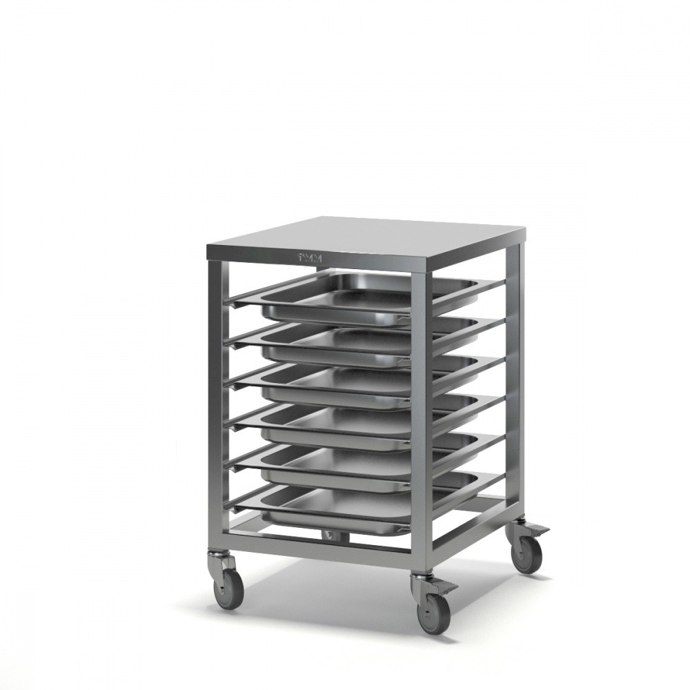 Тележка-шпилька ШС выполнена из прочной нержавеющей стали, что обеспечивает долговечность изделия. Поворачиваемые колёса диаметром 100 мм позволяют легко перемещать тележку по кухне, а также обладают двумя стопами для большей устойчивости. Шпилька имеет 6 уровней для установки гастроёмкостей, противней и подносов, а также верхнюю полку.