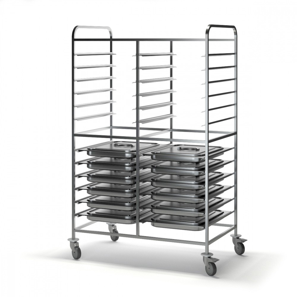 Тележка-шпилька двойная НШ-2 — профессиональное решение для кухонь ресторанов и столовых. Конструкция с 2-мя секциями по 12 уровней каждая позволяет одновременно транспортировать гастроёмкости, противни и подносы стандартов GN 1/1 и GN 2/1. Изготовленная из нержавеющей стали, модель устойчива к коррозии и механическим повреждениям.