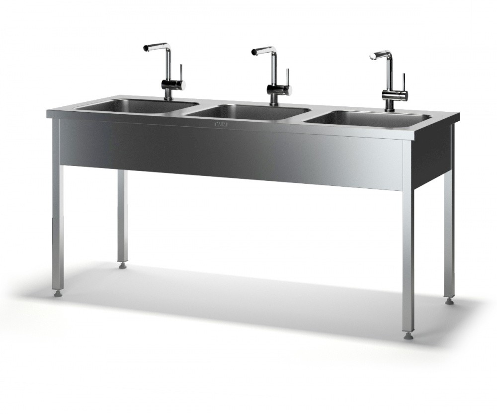 Цельнотянутая мойка с тремя секциями, без борта, каркас - нержавеющая сталь.
